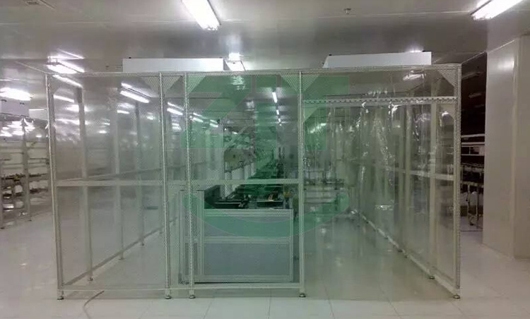 潔凈棚采用工業(yè)鋁材(或不銹鋼方通、鐵方通噴塑)作為框架,風(fēng)機(jī)濾網(wǎng)機(jī)組(FFU)送風(fēng),四周懸掛防靜電垂簾(或鋼化玻璃),其內(nèi)部?jī)艋?jí)別可達(dá)到100-10000級(jí)。適用于操作區(qū)內(nèi)局部?jī)艋?jí)別要求高的區(qū)域。